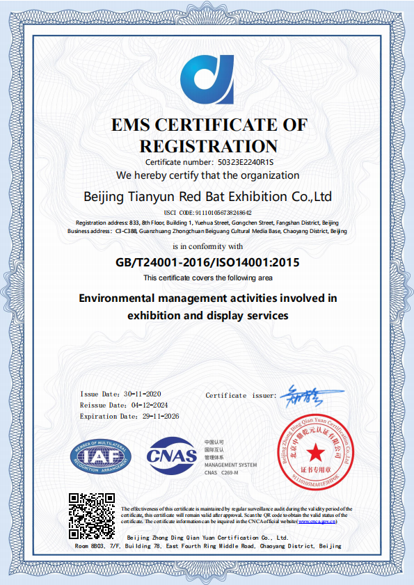紅蝠展示致力于大型會展活動的承辦、主場運(yùn)營管理、展臺設(shè)計承建、數(shù)字化多媒體以及商業(yè)空間的全案塑造服務(wù)。我們以提供定制化服務(wù)為己任,力求改善提升企業(yè)品牌形象。今天,我們在中國設(shè)立了9處分公司及制作加工工廠,和3處海外項(xiàng)目運(yùn)營合作分支。主創(chuàng)設(shè)計由來自中國大陸及海外歸來的優(yōu)秀設(shè)計師、策劃師組成。并建立了完善的項(xiàng)目運(yùn)作與管理系統(tǒng),有效控制項(xiàng)目實(shí)施全過程的順利進(jìn)行,保障設(shè)計成果的完美實(shí)現(xiàn),積極分擔(dān)客戶在項(xiàng)目管理方面的精力投入。2015年我們獲得由中國展覽館協(xié)會頒發(fā)的:中國展覽工程施工一級企業(yè)資質(zhì),并通過了ISO9001質(zhì)量管理體系及ISO14001環(huán)境管理體系認(rèn)證。